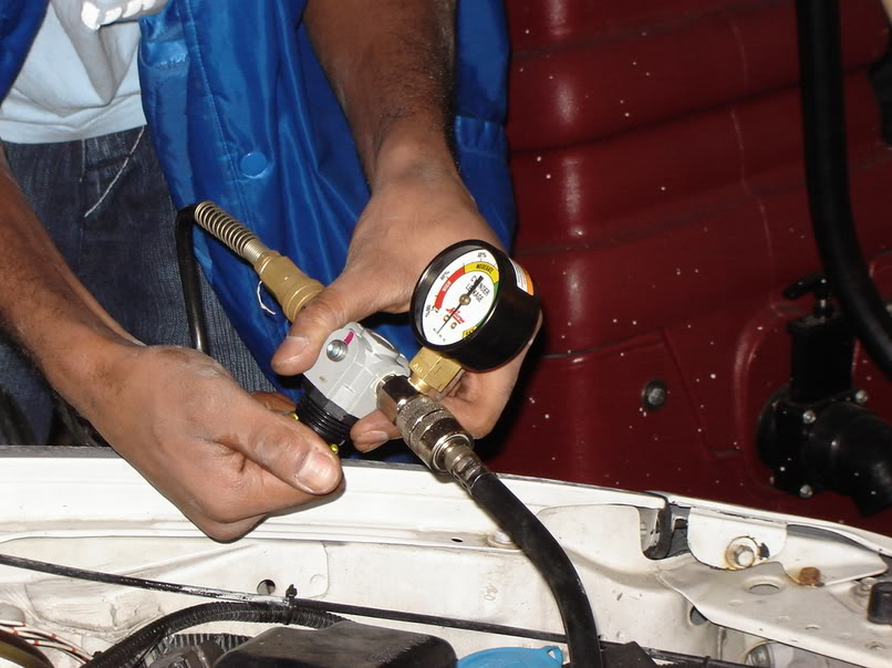 10) Attach the other half of the leakdown tester (gauge) to the hose in the spark plug hole, cylinder 1 and read the percentage of air that is leaking out of the cylinder.