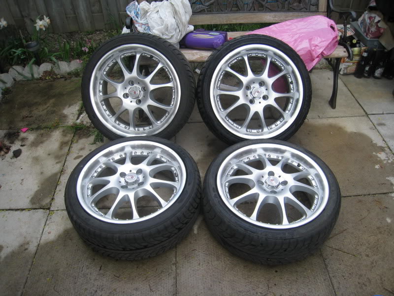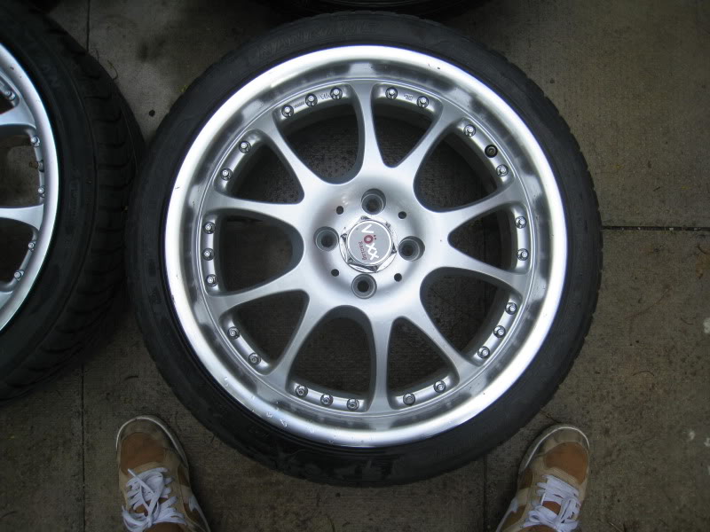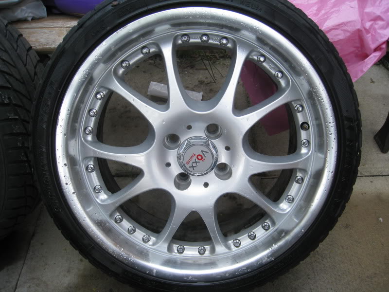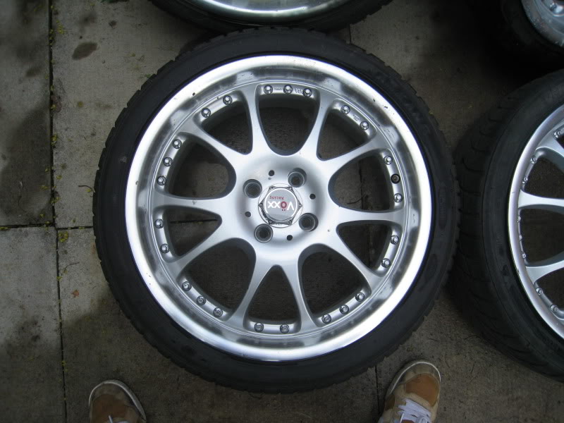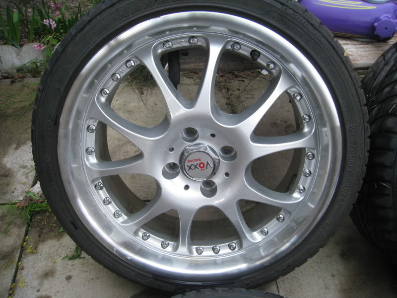 as the title says....up for grabs are my 17" voxx racing rims...bolt pattern is 4X100 and tire size is 205-40R-17 nankang rubber.....not sure about the offset but just so you know they were on my 92 integra lowered a little more than 2inches.....did not rub at all....condition is 8.5 - 9 /10....reason is there are a few tiny scratches here and there....but no curb rashes.....color is silver with polished lips and 2 out of 4 have camber wear but still useable....tires itself have about 75% thread life except for the 2 tires with camber wear....rims are a little dirty but still in amazing shape....lips need some cleaning an repolishing...other than that your good to go.....honestly, these are not bad for italian made rims....anyway...on to the pics....