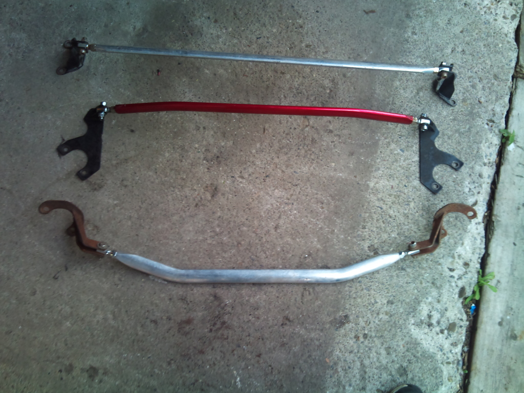 40 bucks each Also my integra DA strut bars. I have 2 front strut bars for sale. ABS(Red) and non ABS(Bottom strut bar in the pic). Also 1 rear strut bar(top strut bar in the pic)