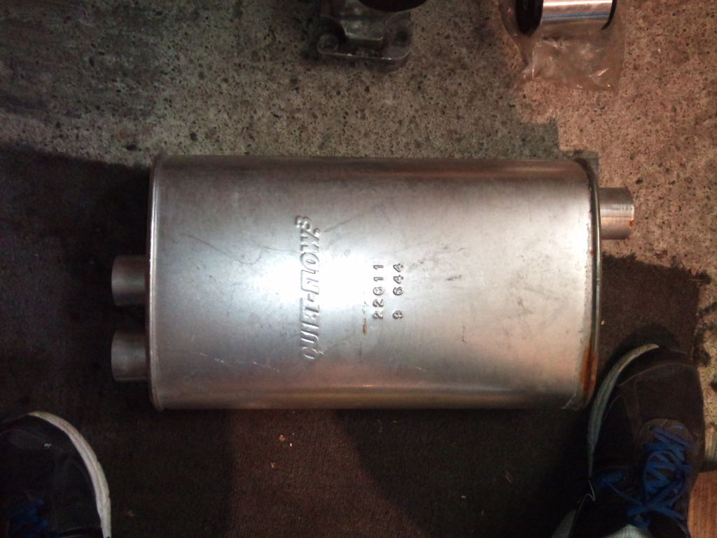 40 bucks Quietflow Muffler. Inlet is 2.5 inches, The 2 outlets are 2.125 inches (Never used has surface rust)