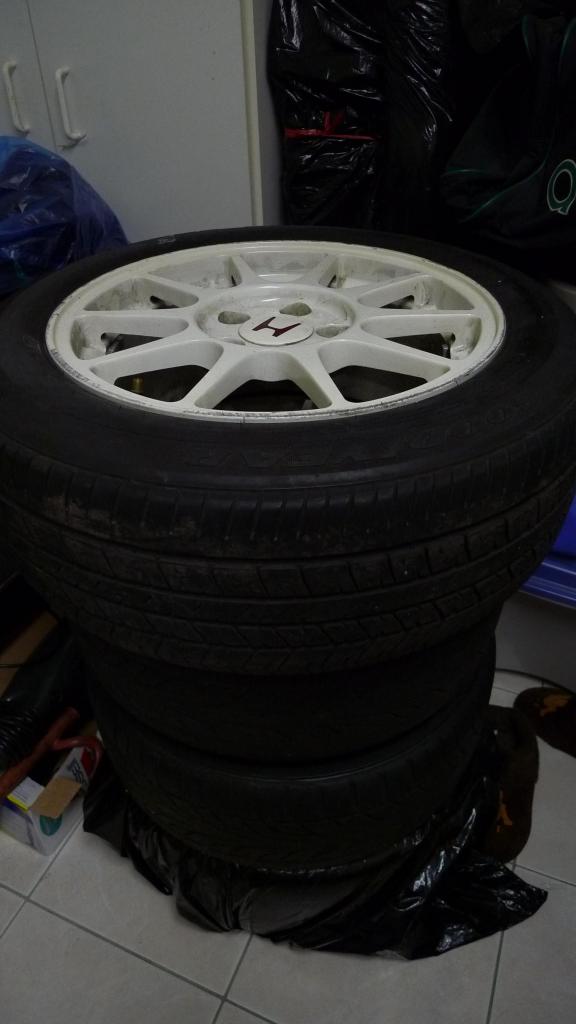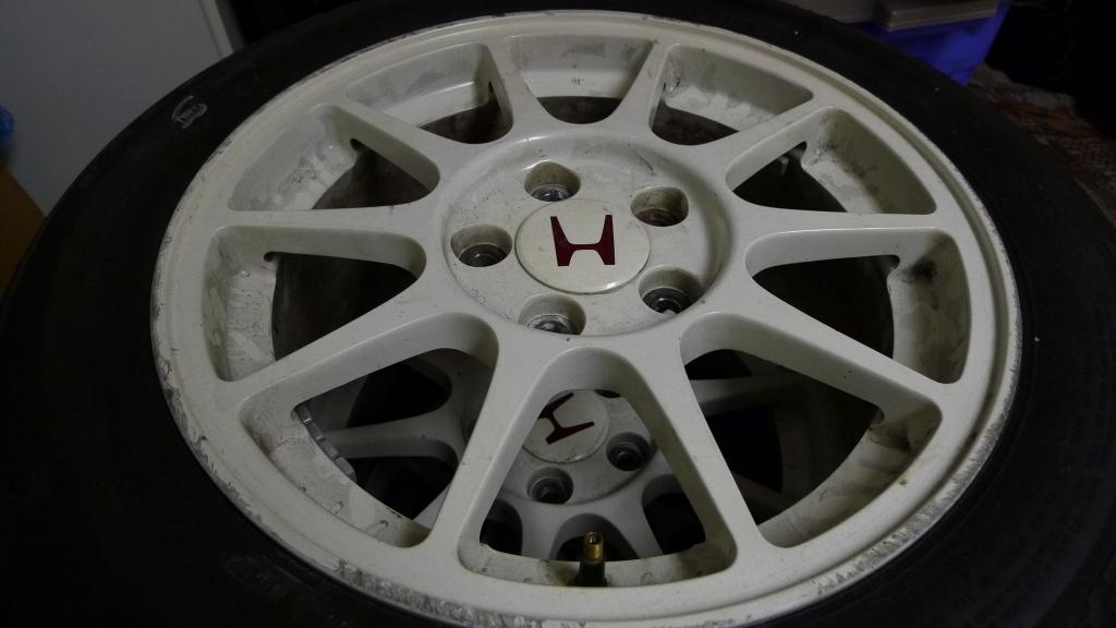 Bought them from JDMLand before the winter. Was planning to refinish them DIY but don't have the time. Comes with different size of rubbers for protection only, two of the tires might still be usable. All four wheels have different degrees of curb rash.