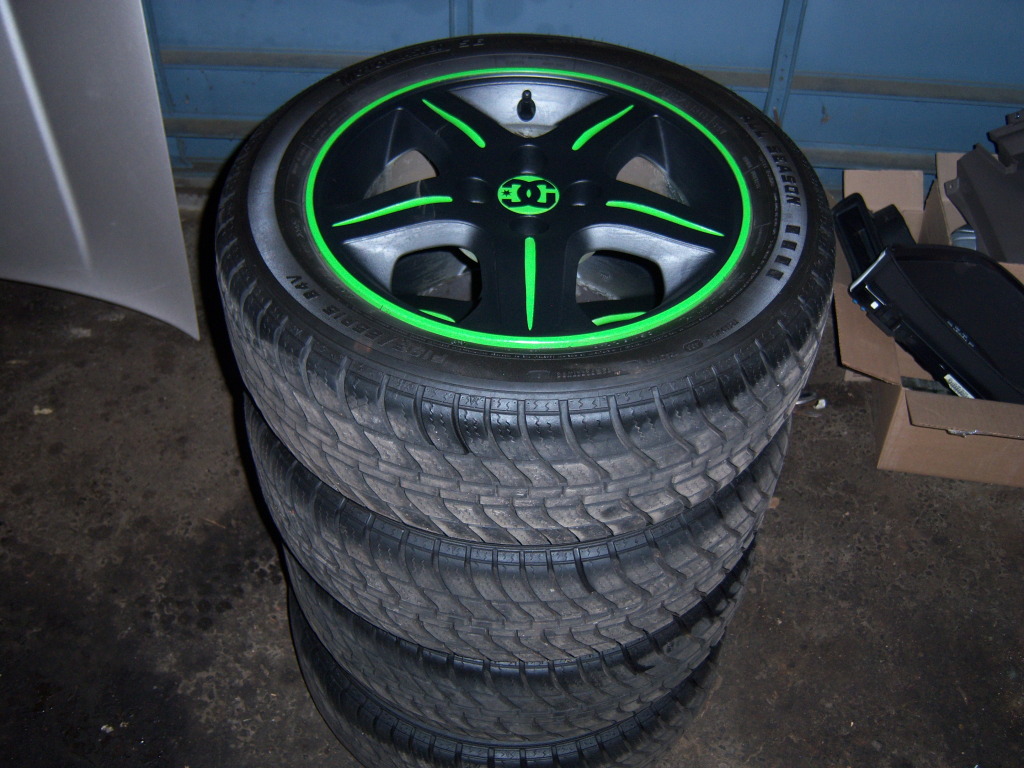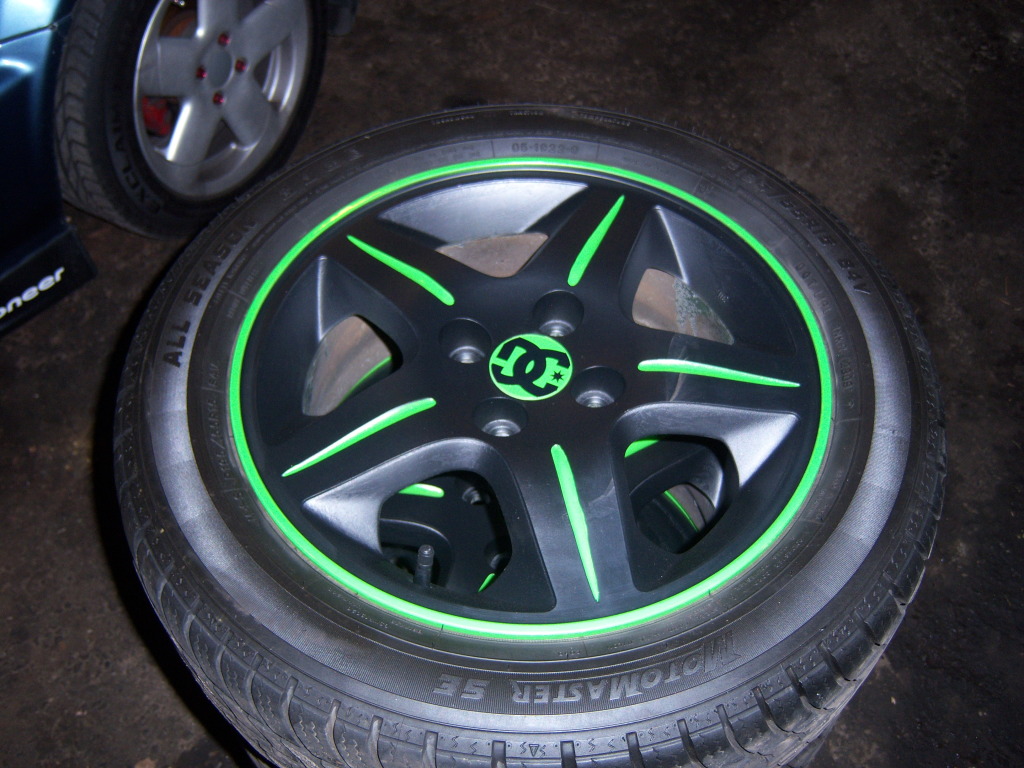 They are from a 1999 Acura EL for sale. The wheels are 5 spoke 15 x 6" 4 x 100mm bolt pattern. The tires are Motomaster SE's in a P195/55R15, the fronts are brand new with only around 5000kms on them. The rears have around 10000kms on them and have some camber wear on the inside due to a misalignment. I had the wheels listed for awhile and wasn't getting much interest so I painted them low gloss black with a lime green lip and highlights. The center caps are green with DC decals. The wheels are all straight and were just balanced and are ready to go. I am asking $350 O.B.O. for the set