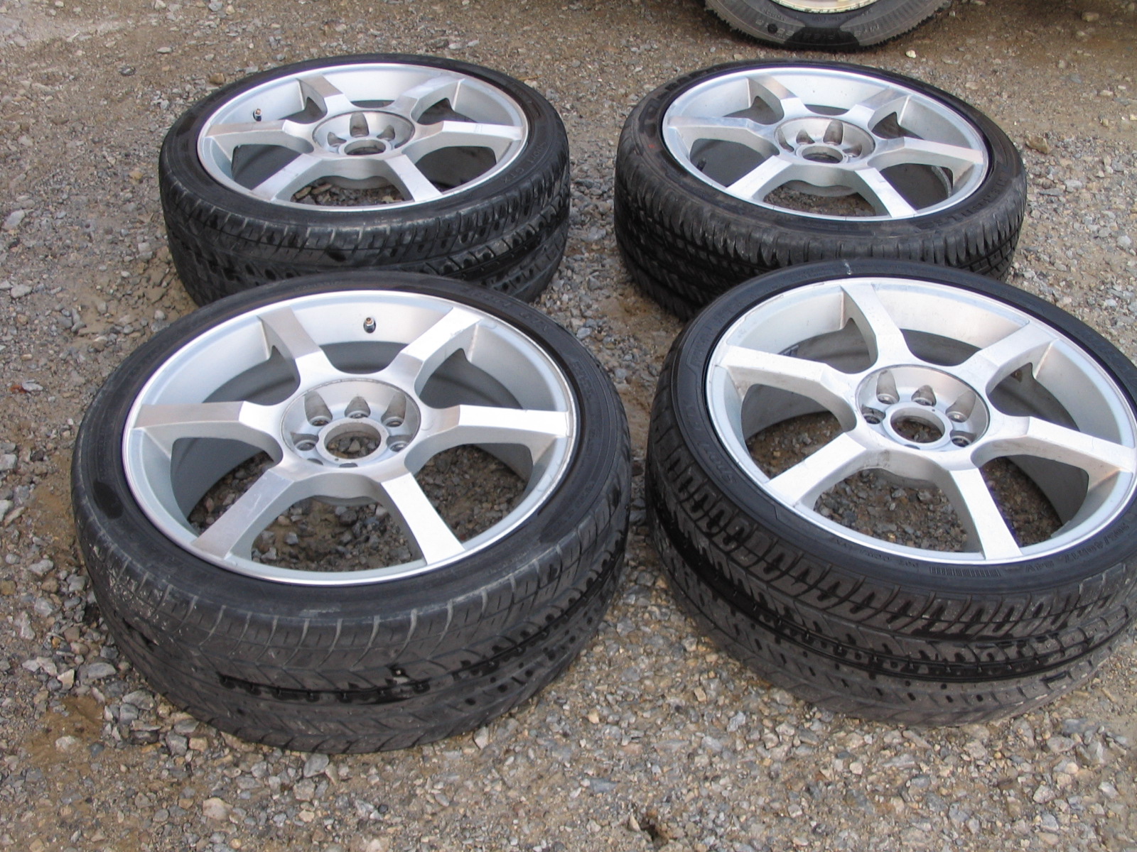 They are in very good shape with some minor scuffs. The tires are 205/40/17 Mirada Sport GTX. Three of the tires have about 75% tread left, and one tire needs to be replaced.