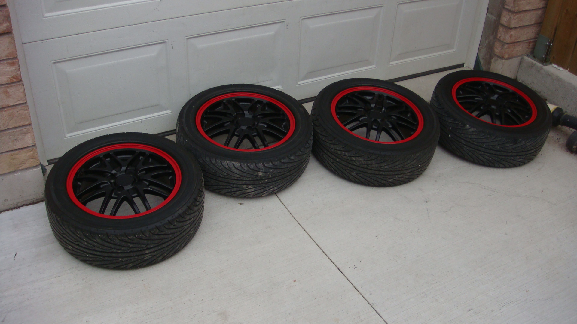 Professionally painted black with red lip; wrapped with Yokahama ES100 tires.(paid $850 for tires; 3 months of use)