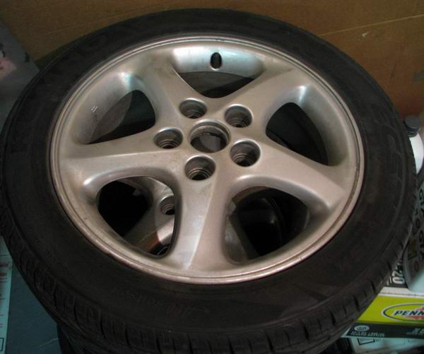 Four 2002 Mazda Protege OEM Rims in beat up shape with no centre caps (curb rash, some oxidation) but still round and balanced with 205/50/16 Kumho ASX tires less than 1000km on tires.