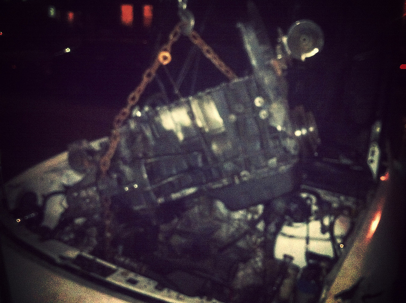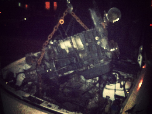 Pulled an all nighter after getting home at 11, got the motor & tranny sitting on the mounts, installed the accessories, ac, ps, alt, starter, in the rain by myself. Not bad considering I was doing this on 3hrs of sleep from the night before.