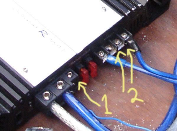The white one is POS going out of amp. The small wire is still your remote. Put the small blue wire in the far right slot (beside the big blue one). the remote wire is a 12v trigger that sends a low current signal to turn the deck on when the amp turns on. has the fuse under the hood or amp been checked yet? does the amp turn on? if you suspect there's something wrong with the remote turn on lead, you can take a small wire use it as a jumper wire between the positive/12v+/B+ of the amp and the remote turn on terminal. don't connect the trigger lead to the ones you have labelled "2" in your picture. those are the outputs of the amp going to your subwoofers/speakers. if you find any of this confusing, cut your losses and take it to a shop, otherwise sparks are going to fly or you'll end up breaking something, if you haven't done so already. |
