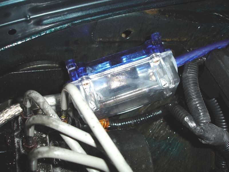 the fuse on the amp looks fine, and i tried to open the box with the fuse that was under the hood but couldn't. I opened the 4 screws but the top was sealed shut, couldn't get it apart from the blue part. So i just left it like that for now. as for the ground cables, the one in the trunk is attached fine, but i don't know exactly where the ground cable is under the hood. i can see the cable coming from behind the battery and going around like it shows in the pic and it just wraps around goes under some wires and then it's attached to the battery terminal so i don't know where it is grounded under the hood :confused: |