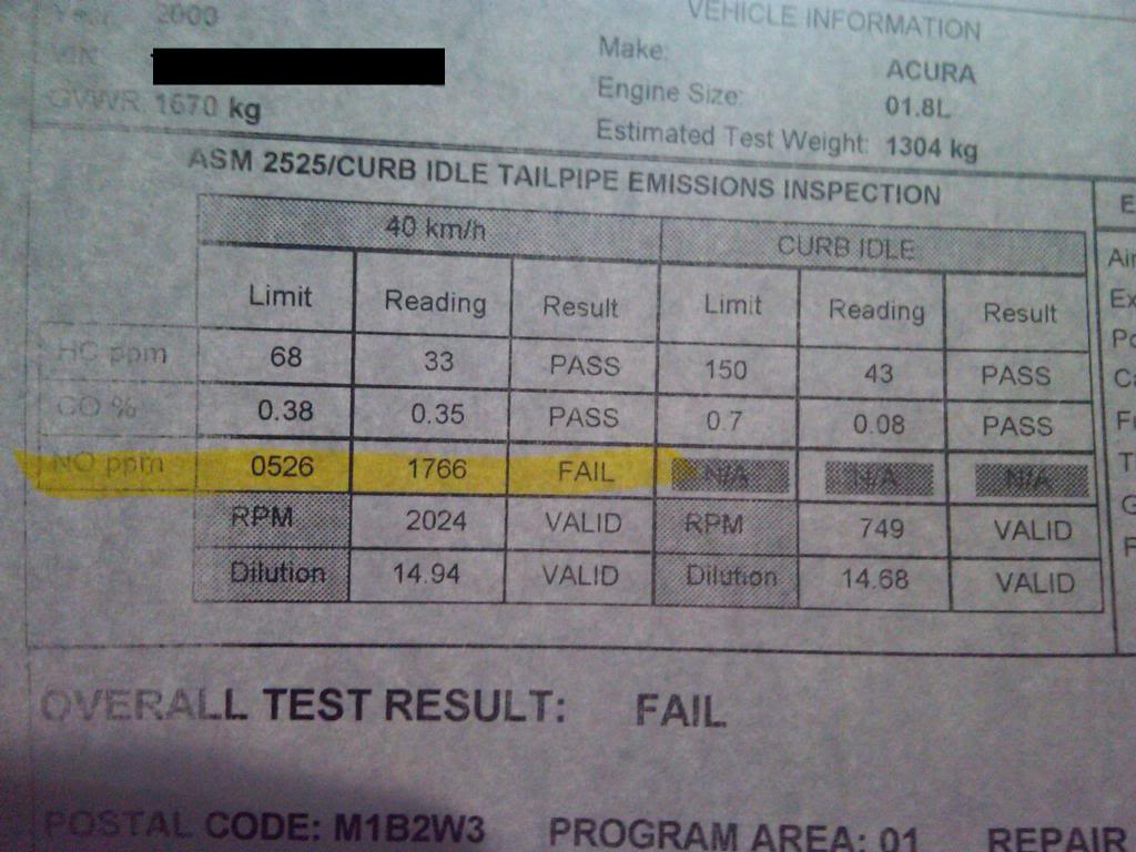 I went in for my etest and failed it. There were my numbers: Attachment 8775 I put in a bottle of "guaranteed to pass" stuff from canadian tire, and ran it through before taking the test. Drove around in 2nd gear for a good while before going in to warm the cat up but i still failed. Need help guys..my sticker expires on the 23rd. Edit: I also have a check engine light.. "Catalyst efficiency below threshold" |