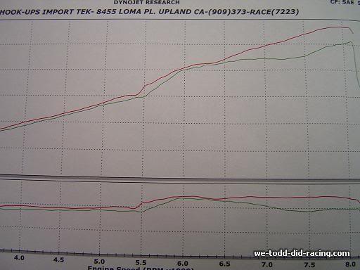 This graph is also posted in the preimere section. Now think about this, when your actually racing/spirited street driving. How often are you at 3000rpm? How about when you shift at redline? Does the needle drop all the way back down to 3000rpm? No. The only good thing about this intake is for those the shift around 5000rpm naturally on the street. But when your talking about actually racing, straight line/auto-x/road race, your rpm's are never that low after you've initial moved off. So it's point less to try and gain "midrange" if for the times you actually need to get going your never at that rpm range. |