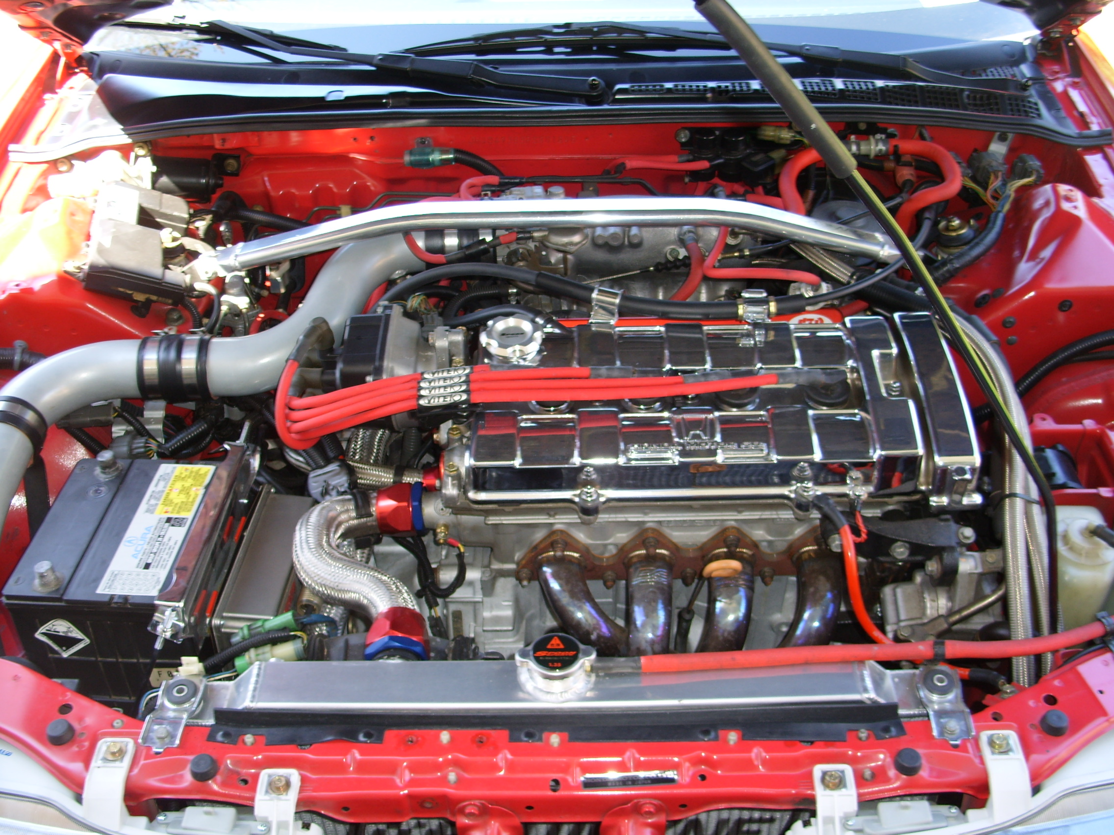 The original motor has been rebuilt(numbers match) balanced and blue printed B18A with crower stroker kit (2.1L) STR block guard, JE pistons 12.0:1 compression (must run 93 octane) ported and polished head (port matched intake and exhaust) 5 angle valve job, fererra valves, crower stage 3 cams, dual valve springs w/titanium retainers, AEM pulleys and cam gears, MSD ignition w/ blaster coil(external), b&m oil cooler, fluidine dual core rad, mugen rad cap, b&m fuel regulator, AEM fuel rail, blueprinted injectors, spoon magnetic drain plugs(oil and tranny), the valve cover, battery tie down upper and rad brackets are all chrome, honda LSD tranny with spoon gear kit, exeddy clutch and plate, lightened flywheel(gsr), DC sports stainless 4-2-1 header and DC stainless exhaust, factory cat is in place but I have a stainless one new in box to go with the car, AEM cold air intake with HKS mushroom in place of the K&N, energy suspension motor mount inserts, the ecm has been re-mapped with a 9500 rev limiter