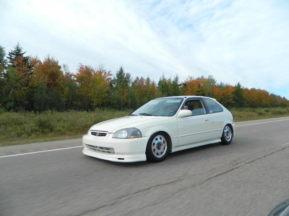 98 civic HB, 5speed Si tranny, OBD1 conversion with a D16Z6 SOHC Vtec, stock shocks with coilovers, Skunk2 front camber kit, DC sport exhaust not loud, Acura EL cluster, Engine bay has a full sticker bombed wrap, wire tuck and brake line tuck, Mugen style front lip and type R style rear lip, Stage 2 CenterForce clutch, Blacked out head lights with yellow lights, car comes with a extra tranny not sure what shape its in came with the car, has a Roof wrap, might have more parts. the car has only around 175 000km's. The car has only steelies and will need new tires.
