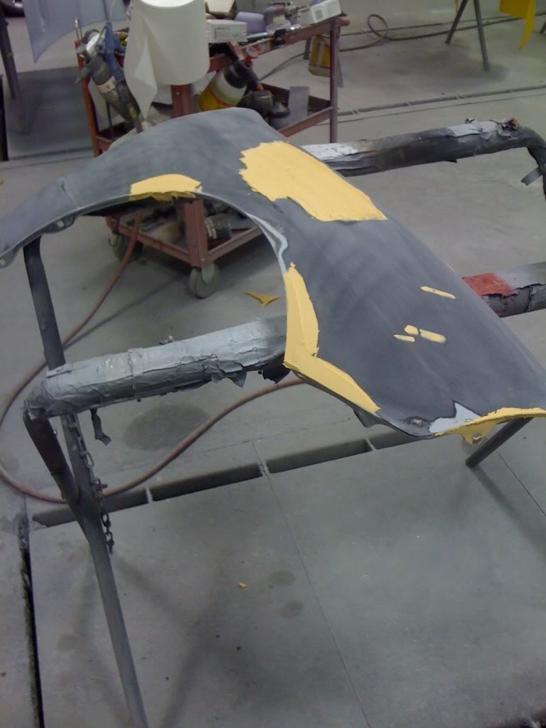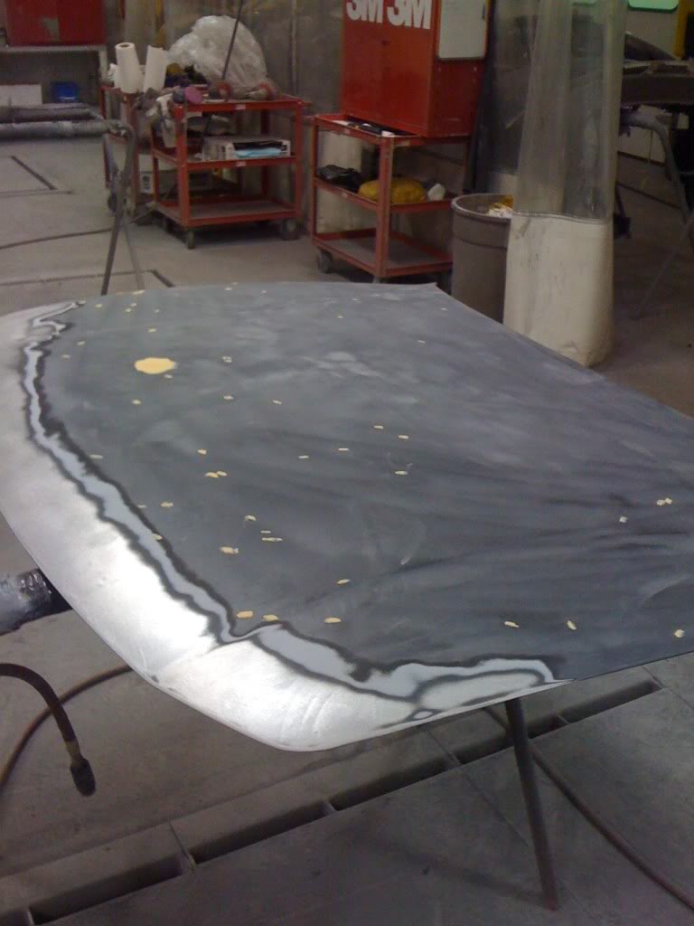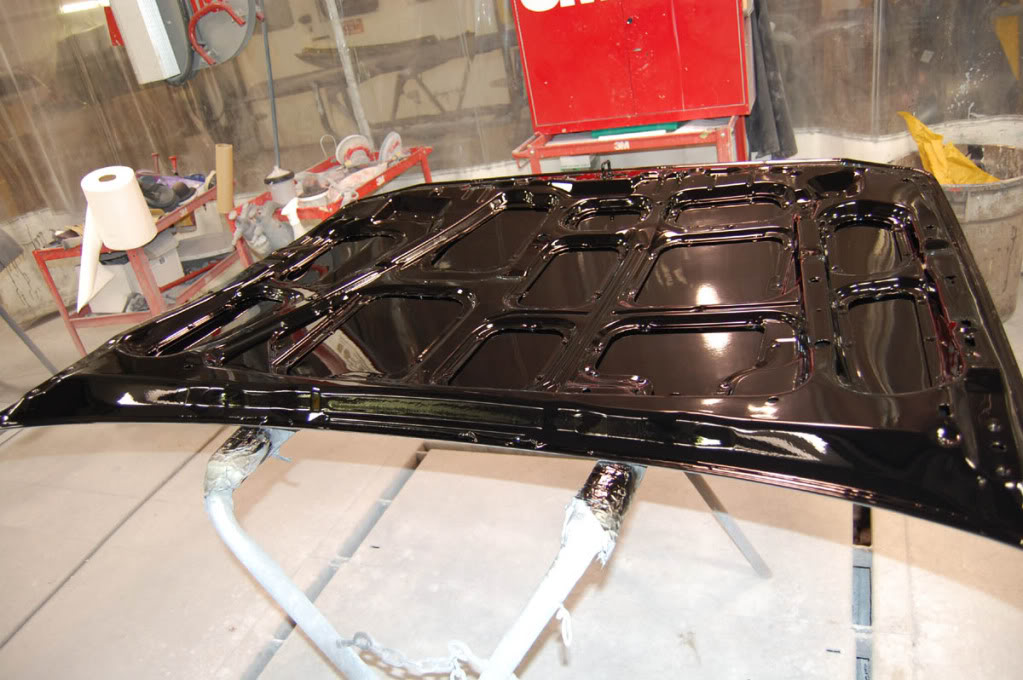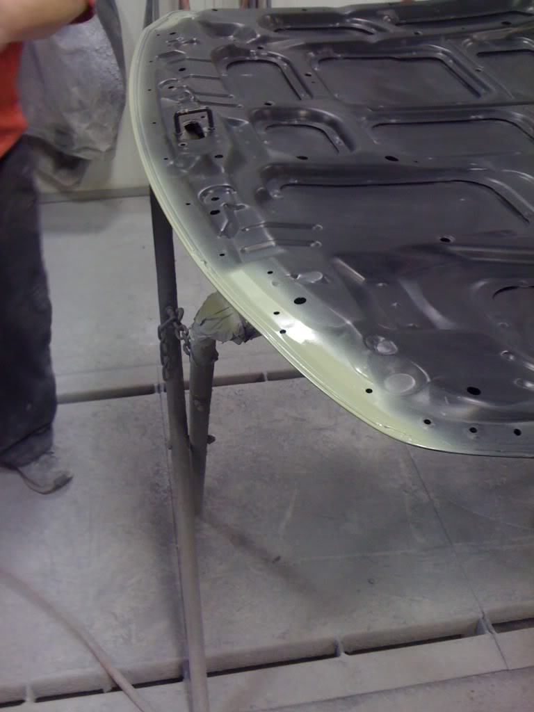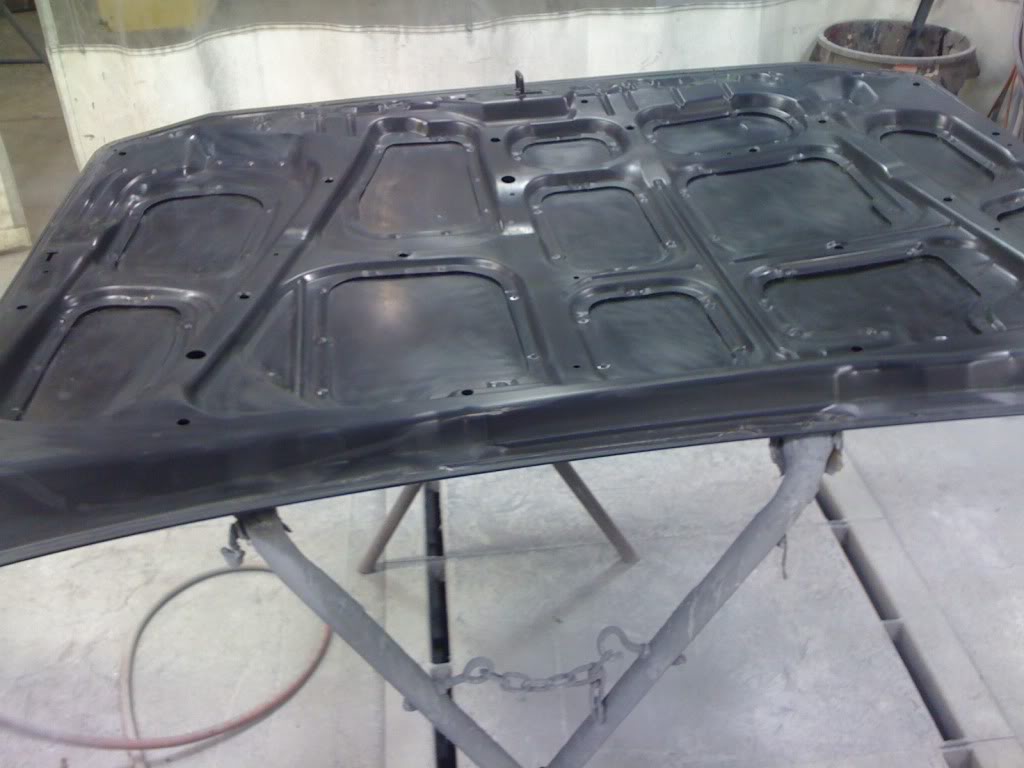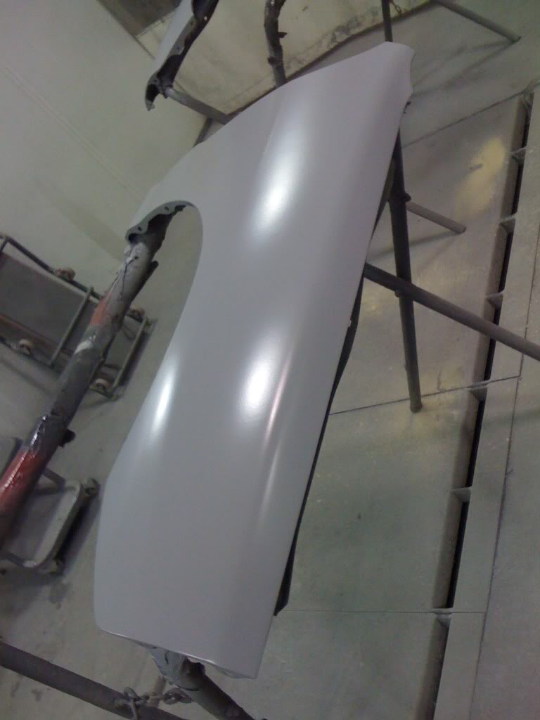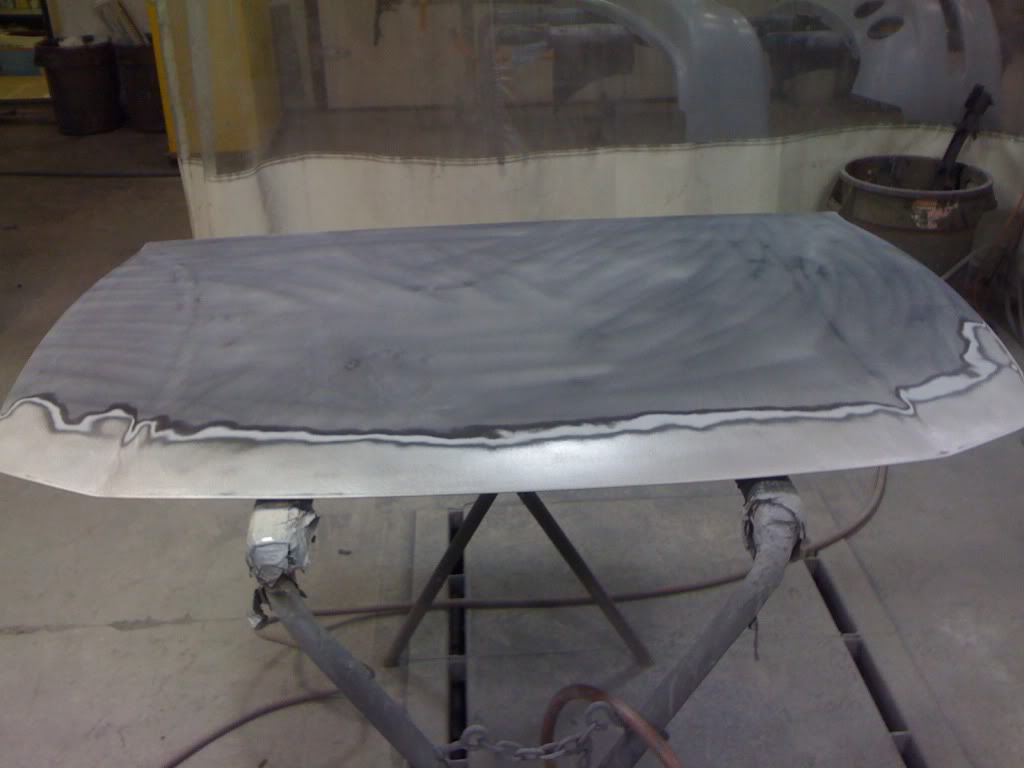 Well here are some more pictures from Wednesday when I went in. Got both bumpers and fenders in primer before I left, and got the hood all sanded down, and after I left, my dad got both the inside of the fenders, and the under side of the hood painted in gloss black, and got the hood primed aswell. Here's the pictures of the parts.