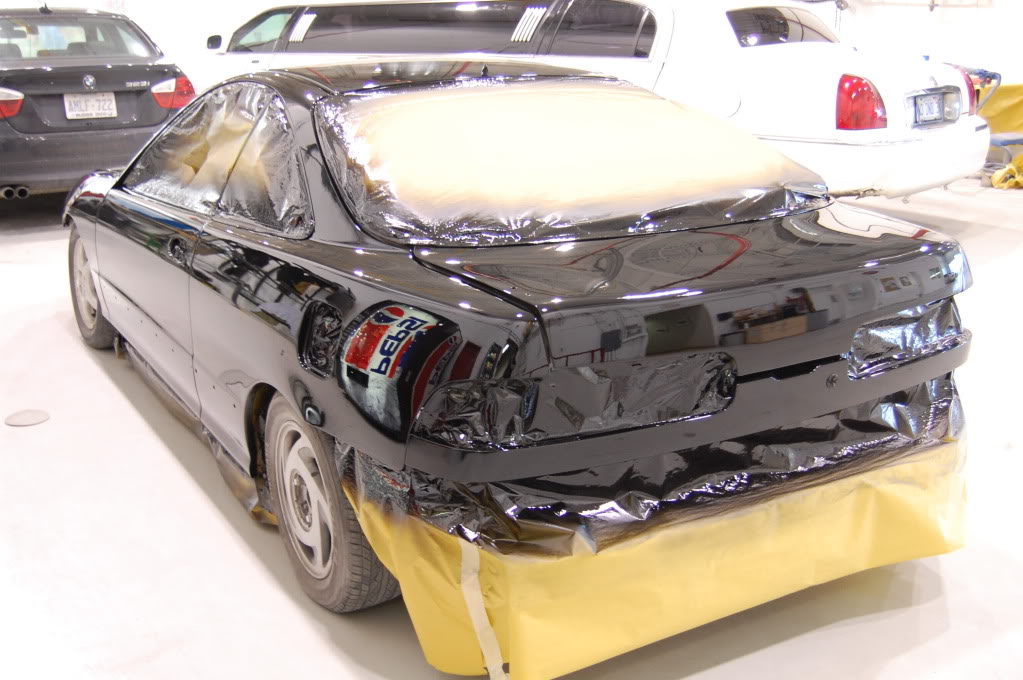 Here only a few pictures of the car with the paper on it when i got there, and then after i took off all the paper and tape. I did get a few other stuff done to the car as well, but you will all get to see it today, as I'm going to get the car all back together, and I will be driving it from now on, unless is snows, and maybe not then, summer tires and snow don't go well together,lol. It's nice having everything shaved on the hatch and having no ugly antenna hole any more. Plus the bumpers, side molding, spoon mirrors, door handles, side skirts, and type-r spoiler where all painted yesturday at 4:15.