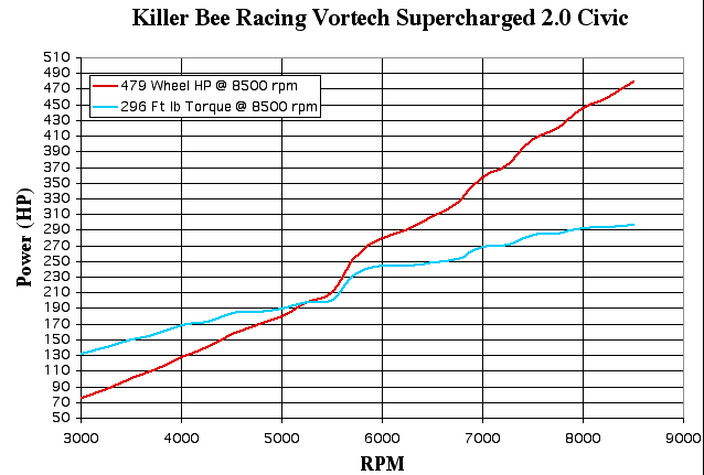 This is a 2 litre Civic motor running with a VORTECH supercharger located in place of the air conditioning pump. Drive is via a custom crank pulley and toothed belt. Intake manifold and head is B16A. Power to the wheels at sea level is 479 hp at 8500 RPM. The intake charge is cooled by iced water. This chart is made in Excel. the power figures were graphed every 250 RPM and the torque curve calculated from the power. (torque was not given to us) This tends to smooth the chart a little. [IMG]http://i288.photobucket.com/albums/l...hpxlschart.gif[/IMG] The boost curve on Vortec superchargers is proportional to RPM. The higher you can rev your car, the more boost you get. As a result Vortech superchargers typically move your torque peak up 750-1000 rpm from stock. It is a good idea to build your engine to handle higher RPMs. By comparison, turbochargers typically move your torque peak down 750-1000 rpm, due mainly to exhaust restriction. [IMG]http://i288.photobucket.com/albums/l...rbeeengine.jpg[/IMG] http://hondata.com/dynoramair.html not to mension, that the dyno you posted was not on a stock motor, that setup must have had the proper supporting mods like a quality big tube header, 3inch exhaust atleast, perhaps cams and other motor work; not only that, but cooling your charge air with ice water isn't really that dailyable now is it? I would bet that most of the power achieved was due to the 2.0ltr block. |