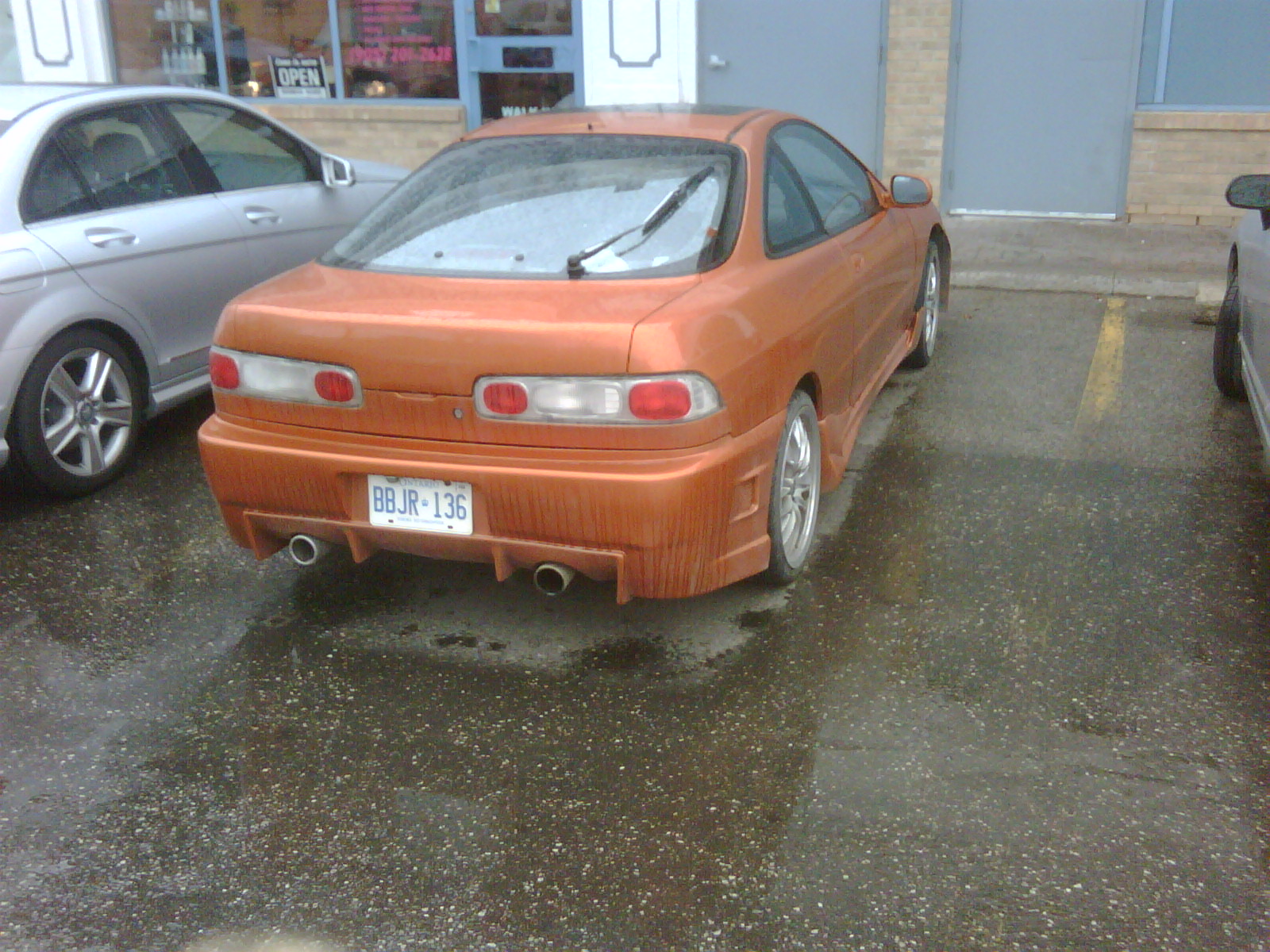 This orange integra is a combination of what not to do to your integra (dual exhaust, altezzas, body kits, mesh, HUGE rims, bad paint, stock height etc.)