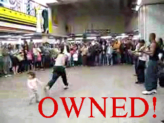Can't you guys see that that is clearly part of the routine?? Notice how they both do cartwheels at the exact same time in different directions? It's called SYNCHRONIZED BREAK DANCING!